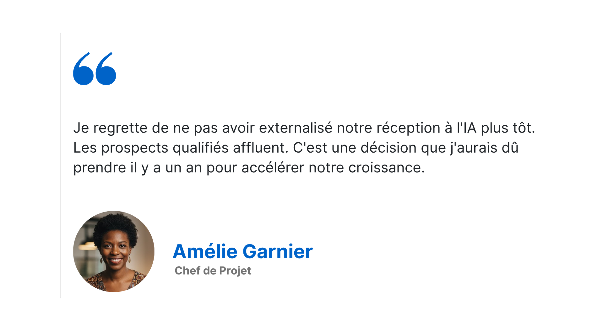 Le recours aux heures supplémentaires pour couvrir les absences pour maladie ou congés est éliminé grâce à la réceptionniste IA, qui garantit une permanence téléphonique 24h/24 et 7j/7. Cette dernière automatise les tâches routinières telles que le filtrage des appels et le blocage des spams, réduisant ainsi le temps consacré aux tâches manuelles et les besoins en personnel.